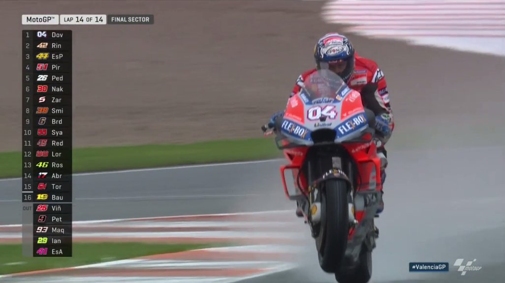 Sejak awal, balapan memang berlangsung di trek basah. Lintasan tergenang air karena hujan deras terus mengguyur Sirkuit Ricardo Tormo.